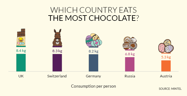 Researcher Mintel says countries leading the way in Easter chocolate innovation include Brazil, which accounted for 11 per cent of global Easter chocolate product launches in 2017, followed by the UK, South Africa, Germany (each with a 10% share) and France (9%).